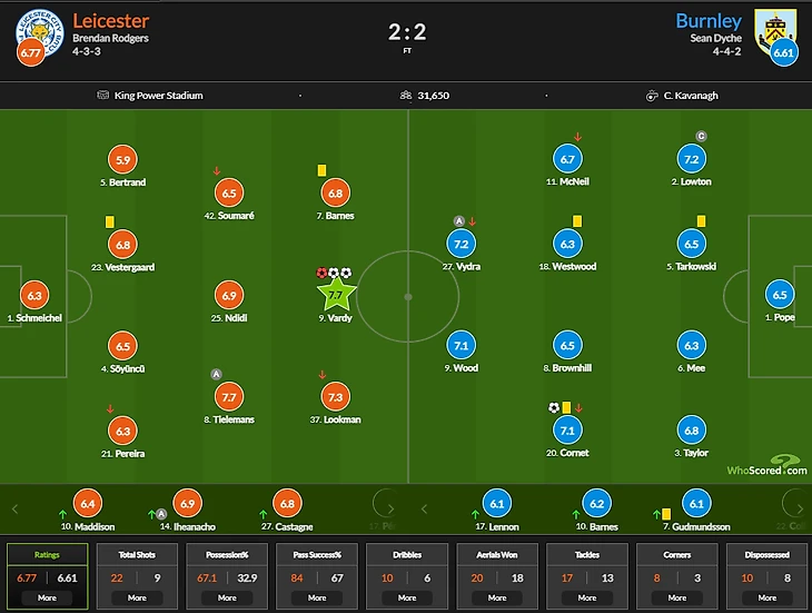 Разумеется, по большинству критериев Лестер был сильнее и, пожалуй, заслужил взять свои 3 очка, но финальная стадия завершения атак хромала. Варди забил три мяча, но это, к сожалению, не тот хет-трик, которым стоит гордиться: Джейми открыл счет в матче, забив головой в свои ворота при розыгрыше углового. Правда, потом Варди себя еще как реабилитировал, положив дубль, но для победы этого не хватило.