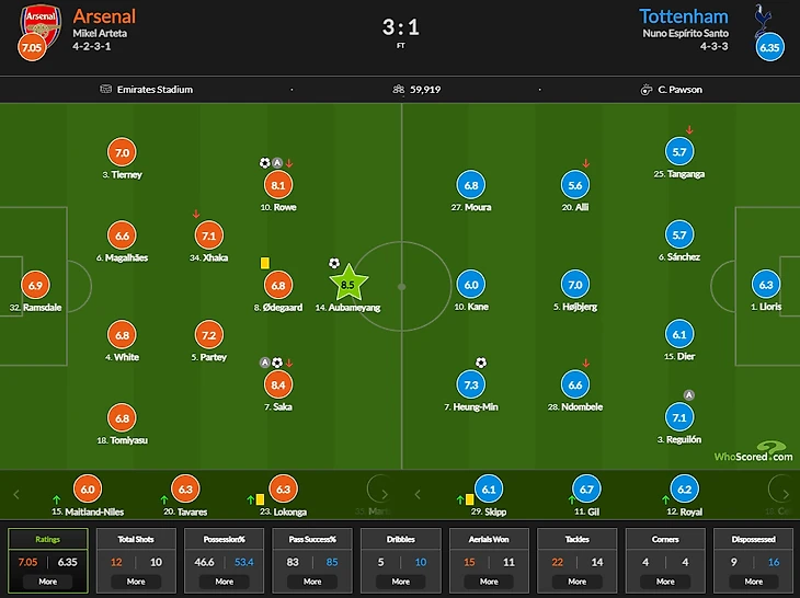 Идея Санту была понятна заранее: Тоттенхэм отдает мяч Арсеналу, делая ставку на контратаки, но Артета отказался от владения, а позиционные атаки Спурс после ухода Поча регрессируют от сезона к сезону. Кейн имел несколько шансов, но в целом провел очередной плохой матч: брак, потери, неудачные попытки дриблинга.