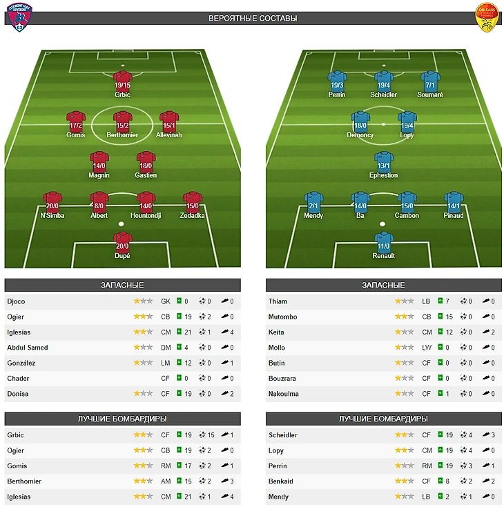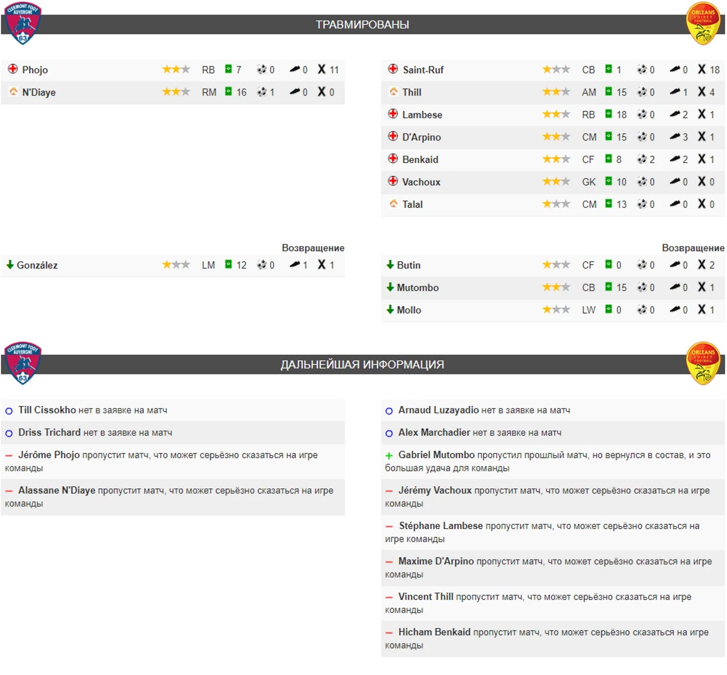 «Орлеан» отправился на матч против «Клермона» без ряда важных игроков. Эксперты отмечают потерю сразу 5-ти ведущих исполнителей: Jérémy Vachoux, Stéphane Lambese, Maxime D'Arpino, Vincent Thill, Hicham Benkaid. Все потери относительно недавние. Судя по всему, на лавке у «Орлеана» будут присутствовать только три игрока, которые провели в текущем сезоне более одного матча. Что касается хозяев поединка, то у них с составом все значительно оптимистичнее 👇