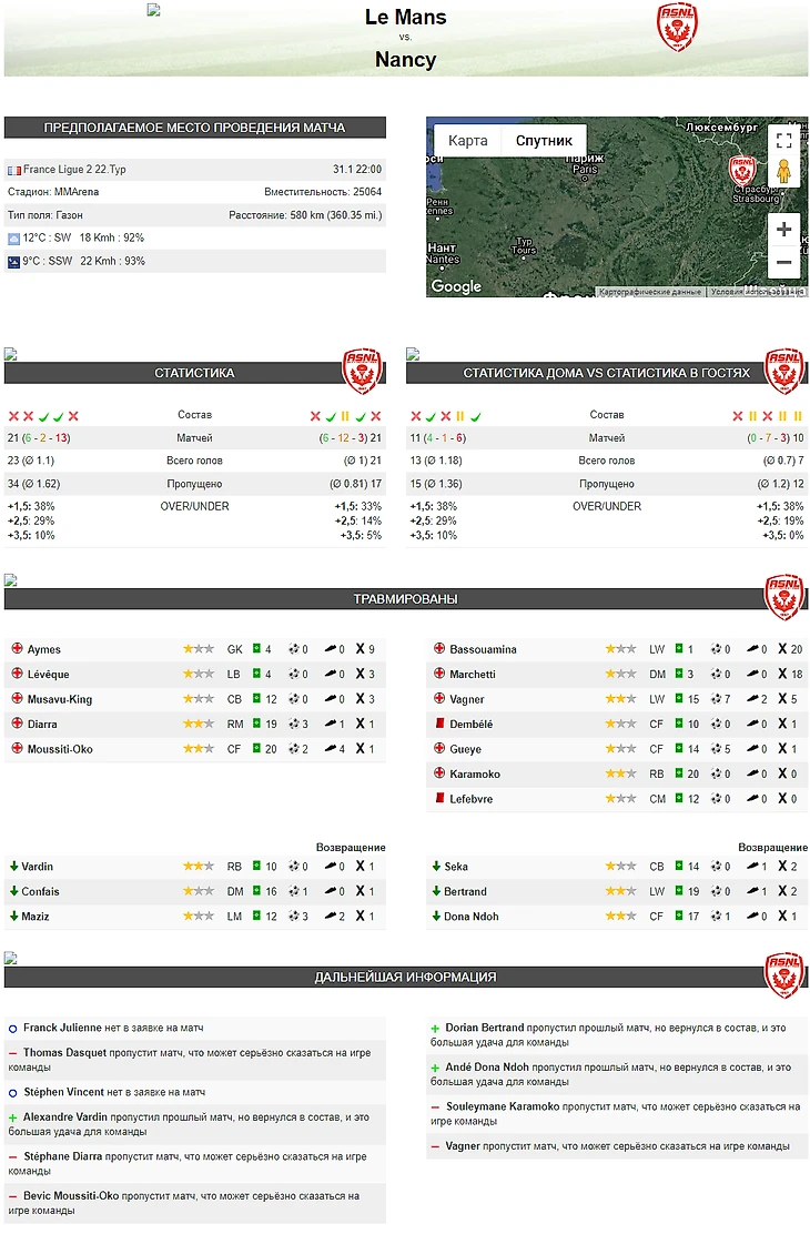 Еще одна интересная встреча. У обоих клубов есть проблемы с составом, однако, на мой взгляд, у гостей они серьезнее. За «Нанси» не сыграют два главных голеадора команды — Vagner (14 появлений на поле / 7 голов / 2 ассиста) и Gueye (14 появлений на поле / 5 голов). «Нанси» в 21-ом матче лиги отметился 21-м голом, а эти два игрока забили 12 из них 👇