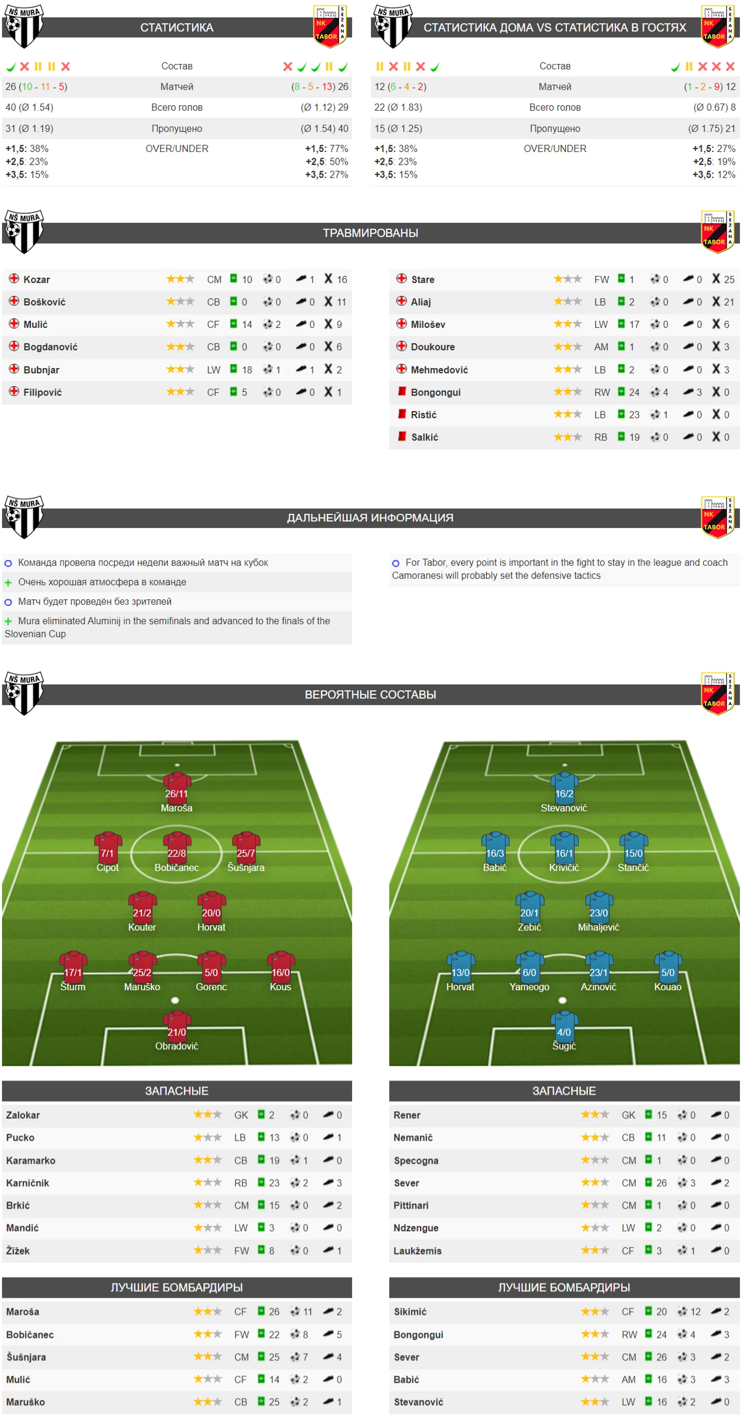 Вечером в рамках чемпионата Словении команда Каморанези на выезде сыграет с клубом, который имеет незамысловатое название «Мура». Хозяева борются за попадание в Лигу Европы, а гости за право оставаться в 1-й лиге. «Табор», казалось бы, набрал хорошую форму (3 победы в 5 последних матчах), но сегодня у него определенно есть проблемы. Давайте взглянем на кадровую ситуацию: