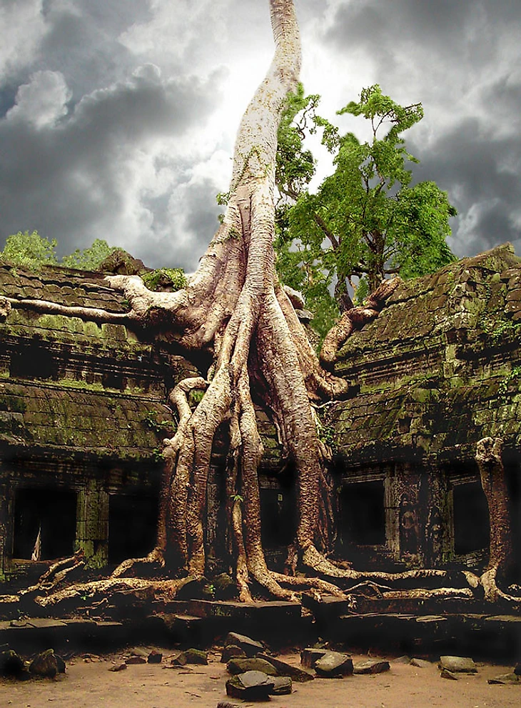 Уникальные сейбы произрастают на руинах древнего камбоджийского храмового комплекса Ангкор-Ват. Их корни давно уже образовали единое целое с древними каменными постройками величественного храма.