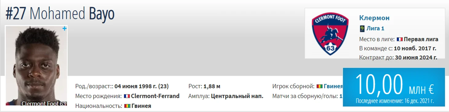 Как мы уже проговорились выше, Байо является воспитанником как города, где базируется "Клермон", так и клуба. Родилась легенда "Клермона" в семье гвинейских интеллигентов, приехавших в Клермон-Ферран получать образование. Хотели получить образование, а в итоге породили легенду. Думаю, не стоит вам объяснять в академии какого клуба начал свой путь Мохамед "Волшебник" Байо. Стоит сказать, что за взрослый "Клермон" Мохамед впервые вышел на поле в кубковом матче против команды "Мулен-Изур", в котором отбегал 14 минут. В сезоне 18/19 Байо начал появляться чаще, даже в матчах чемпионата, набрав следующие цифры: 5 матчей Лиги + 4 матчах Кубка, где в одной из кубковых встреч Байо забил свой первый гол за "Клермон" - в игре против "Стад Лаваль". И тут руководство "крестоносцев" несколько неуважительно отнеслось к будущей легенде - отправил Байо в аренду да не в какой-нибудь клуб Лиги 2, а в Третий дивизион - в цепкие и заботливые руки команды "Дюнкерк". В первые полгода за клуб из города, знаменитого своей военной операцией, Мохамед разродился 2 голами и 1 ассистом. Новый сезон за "Дюнкерк" - новые цифры, чуть лучше, намного лучше, ну просто космос: 24 матча и 12 голов с пятью ассистами, 2 гола в Кубке Франции. Помимо прочего, после такой прекрасной результативности за "Дюнкерк" Байо ожидаемо позвали в сборную Гвинеи, где за свои первые 4 матча потрясающий воспитанник "Клермона" забил дважды и соорудил один важнейший ассист в матчах Квалификации к ЧМ. Очевидно, что руководство "Клермона" получило информацию о феноменальной статистики молодого гвинейца в Третьей Лиге и немедленно привезло его сюда, в Клермон-Ферран, помогать команде в Лиге 2. И гвинеец помог, да как помог! Он, буквально, на руках вывел команду в Высший дивизион: в 38 турах Байо отгрузил аж 22 гола и отдал 7 передач, став лучшим бомбардиром того розыгрыша Лиги 2 (с улыбкой на лице замечаю, что Мохамед положил трёшку в ворота "Дюнкерка"). В этом сезоне гвинеец продолжает идти по бомбардирскому графику: 9 голов в 19 играх для человека, играющего в команде-дебютанте турнира - это прекрасный показатель. Отметим также, что в этом сезоне Байо уезжал с Гвинеей на Кубок Африки, но к сожалению неудачно, как для всей команды, так и для Мохаммеда в отдельности: ни одного результативного действия игрок "Клермона" не смог совершить. И, подводя итог по Байо, ловлю себя на мысли о том, что в отношениях "Клермона" и гвинейца есть два пути, два невероятно разные, но крайне правильных пути: первый - Байо является нашим лидером, он должен оставаться у нас на тысячи лет, пока не захочет сам уйти, потому что он наш стержень и идейный вдохновитель, и без него мы развалимся как команда; второй - Байо стоит 10 лимонов на трансферном рынке, и мы, как маленький клуб, вполне может продать ему куда-нибудь в топовый европейский чемпионат, а на вырученные средства взамен одного лидера купить 2-3 неплохих, качественных игрока, усилив как его позицию, так и несколько других. Оба вывода справедлива, верны, но решать "Клермону". Если вы хотите знать моё мнение - уж лучше пускай Байо остаётся. Так будет лучше для всех, я считаю...