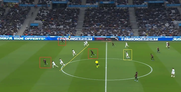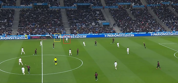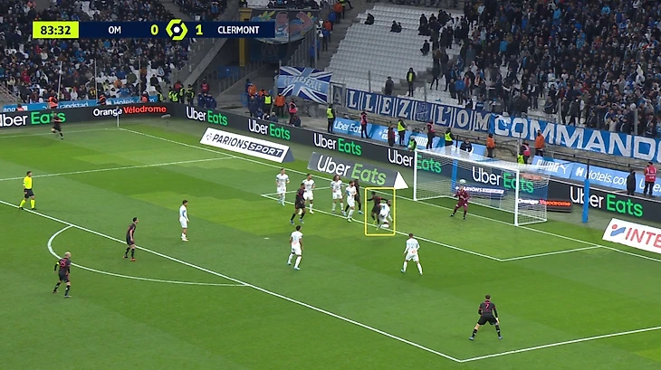 Первый гол случился уже на 13-ой минуте, и его автором стал... нет, вовсе не "Олимпик Марсель". Получивший мяч от вратаря, правый центрбек "Клермона", Сендрик Унтонджи просто каким-то гроссмейстерским чутьём увидел, как правый фланговый - Аким Зедадка - рванул по бровке за спину зазевавшемуся (спойлер: кажется, он проспал сегодня абсолютно всё) Жерсону. Точный пас, хороший приём, Зедадка грамотно, на остатках энергии рывка домчался до штрафной и видя, как перед ним выстраивается линия Колашинац - Чалета-Цар - Салиба - Лирола, отдал сильный пас под удар в район полукруга штрафной, где находился Рашани, однако его опередил Мохамед Байо, вторым темпом догнавший атаку и мощнейшим ударом вонзивший мяч в ворота так часто игравшего за пределами штрафной Пау Лопеса (об этом чуть позже). В чём же причина гола? Вы скажете, что всё дело в шедеврально выверенной передаче Унтонджи. И да, и нет. Да, бенинец выдал шикарную передачу, рассчитав траекторию движения и расстоновку игроков соперника. Но... вы просто посмотрите где находится Жерсон в момент рывка Зедадка - он просто его проспал!