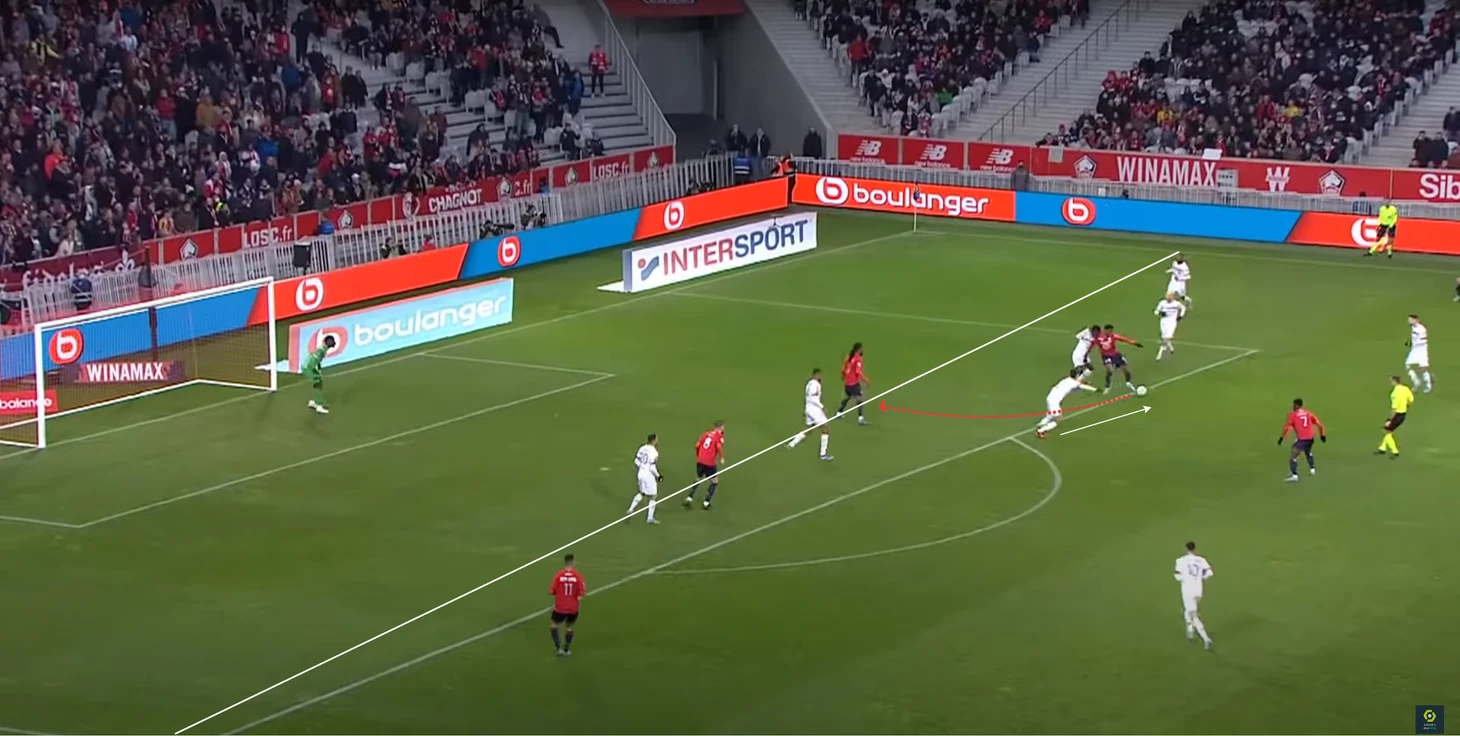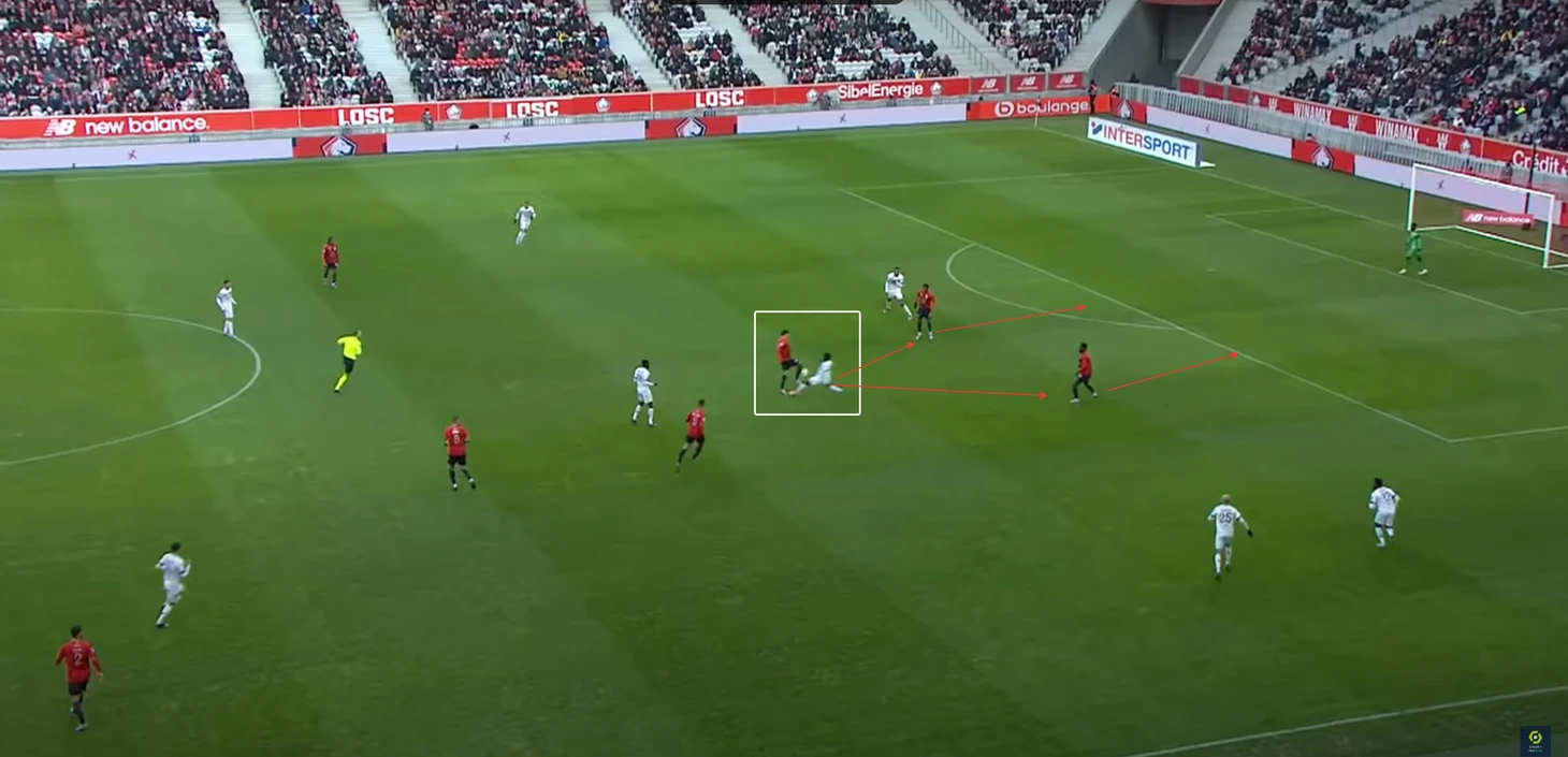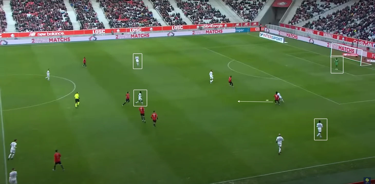 Заметьте также, что остальные защитники, в частности Унтонджи, не успевает за своим оппонентом, а Зедадка, равно как и Сейду в ситуации 2 в 1, априори проиграет. Осознавая это, Зедадка даже не прыгает, а Жонатан Бамба делает счёт 1:0 в пользу "Лилля".