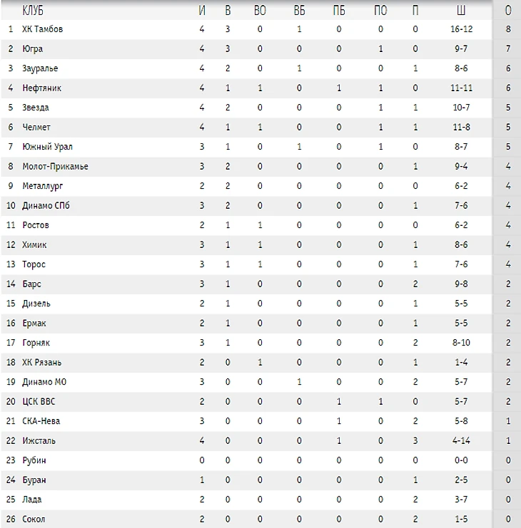 Вот так выглядит турнирная таблица по итогам прошедшей недели. «Тамбов» первый, но он сыграл четыре матча. Отметим, что «Металлург» сыграл два матча, «Буран» один, а «Рубин» ещё вообще не взял старт в сезоне. Из-за разразившейся инфекции в команде тюменский коллектив сыграет лишь ещё не скоро. В любом случае желаем всем командам богатырского здоровья. Чтобы травмы обходили стороной. И главным всегда и везде оставался его Величество – хоккей.
