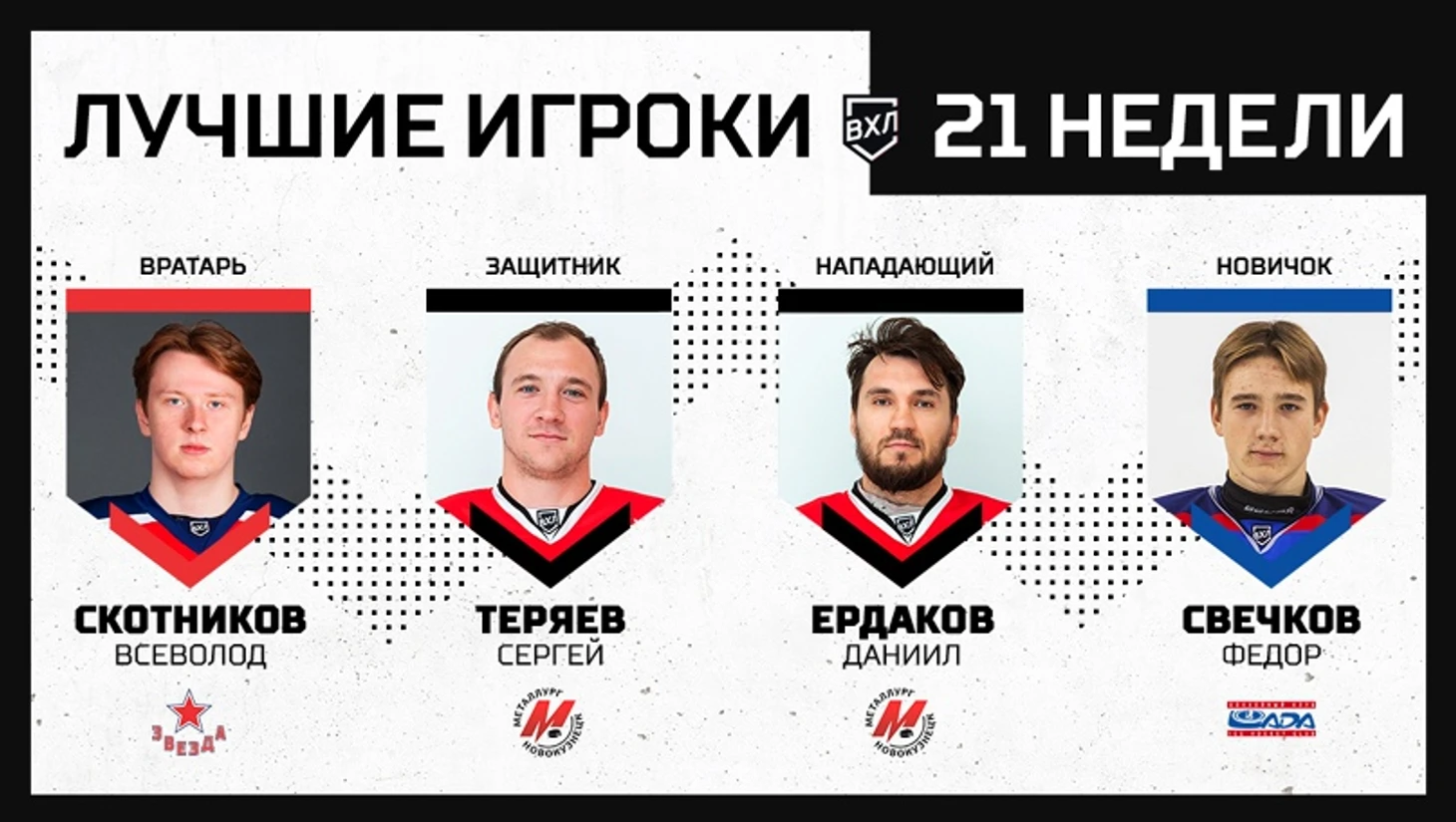 — лучшим вратарем стал голкипер «Звезды» Всеволод Скотников (2001), который на прошлой неделе сыграл в трех победных матчах, отразив 96,2% бросков в створ ворот при коэффициенте надежности 0,97. В одном из матчей Всеволод оставил свои ворота в неприкосновенности.