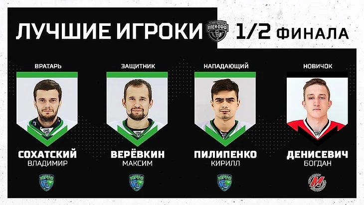 - лучшим вратарем признан Владимир Сохатский (1989) из «Югры», который провел в полуфинале шесть матчей, одержав три победы, две из которых «сухие». Владимир отразил 95,18 % бросков в створ ворот при коэффициенте надежности 1,37.