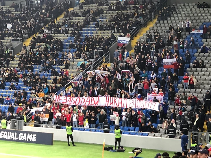 Никакой агрессии у болельщиков не было. Я мог спокойно подпевать «Катюшу» нашему фан-сектору. Кстати, он был компактным, но периодически заглушал остальные 29 тысяч болельщиков. В честь годовщины бомбардировок НАТО Югославии был вывешен тематический баннер и довольно популярной была перекличка «Сербия – Косово». А «Россия!» звучала не чаще, чем «Русь!». Если судить по флагам на нашем секторе были представлены Ярославль, Екатеринбург, Челябинск, Верхняя Салда, Магнитогорск. Как вы видите, часть городов совсем нефутбольные. Но я давно уже заметил, что именно они составляют основу выездов болельщиков российской сборной.