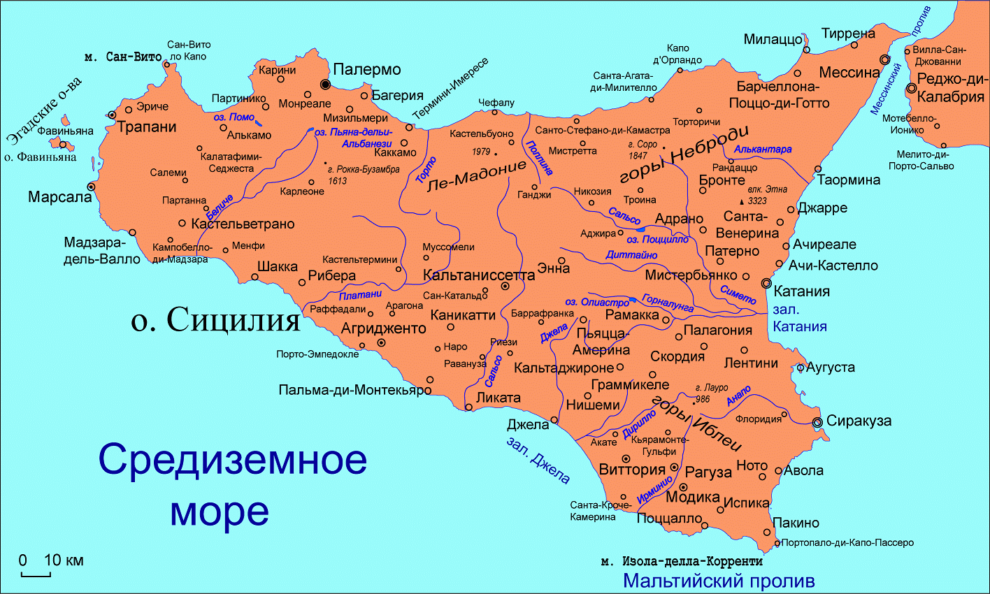 Крупнейший остров Средиземного моря, полностью принадлежит Италии. Занимает площадь 25 тысяч квадратных километров, превосходя по этому показателю Словению и немногим уступая Бельгии. Сицилия - дом для более чем 5 миллионов человек. Расположена в непосредственной близости от Апеннинского полуострова, занимаемого Италией.