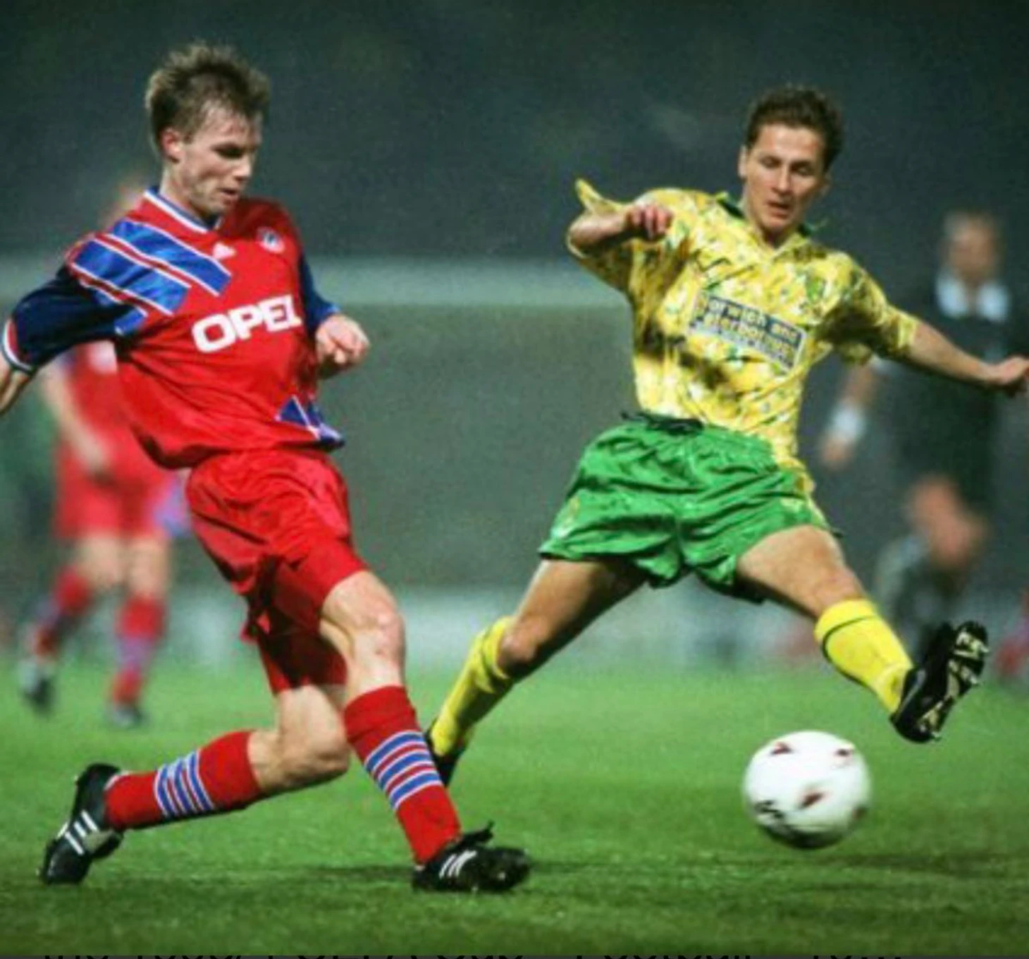 В 1993 году "Бавария" принимала участие в Кубке УЕФА. В первом раунде команда дважды обыграла с общим счетом 7-3 голландский "Твенте", и в 1/16 финала получила в соперники дебютанта еврокубков "Норвич Сити". Первая игра, проходившая в Мюнхене, завершилась сенсационной победой гостей 2-1. Уже к тридцатой минуте гости благодаря точным ударам Джереми Гросса и Марка Боуэна вели 2-0.
