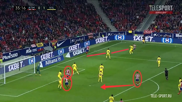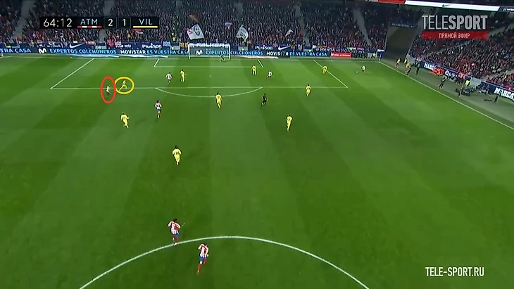 Но после пропущенного мяча у «Атлетико» случились перестановки в рамках той же схемы – Коке переместился направо, Витоло на левый фланг, Сауль стал играть в центре поля, а Корреа переместился в нападение к Морате. Основной упор делался на фланги, когда либо насыщали какую-нибудь часть поля (чаще левую), либо сдваивали фланг благодаря взаимодействию крайнего защитника и полузащитника, а в штрафной под навес или прострел открывалось несколько игроков. Помогали и стандарты, причем был момент и сразу после навеса, и со второго темпа – удачная ситуация, когда соперник выносит мяч из штрафной и некоторое время действует неорганизованно. Гол в итоге пришел не в результате удачной комбинации (Врсалько воспользовался отскоком и направил мяч в штрафную, где Корреа упустил Пау Торрес, изначально находившийся в выгрышной позиции), но мадридцы точно заслужили отыграться по итогам первого тайма.