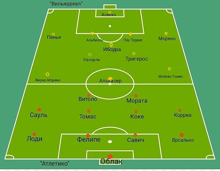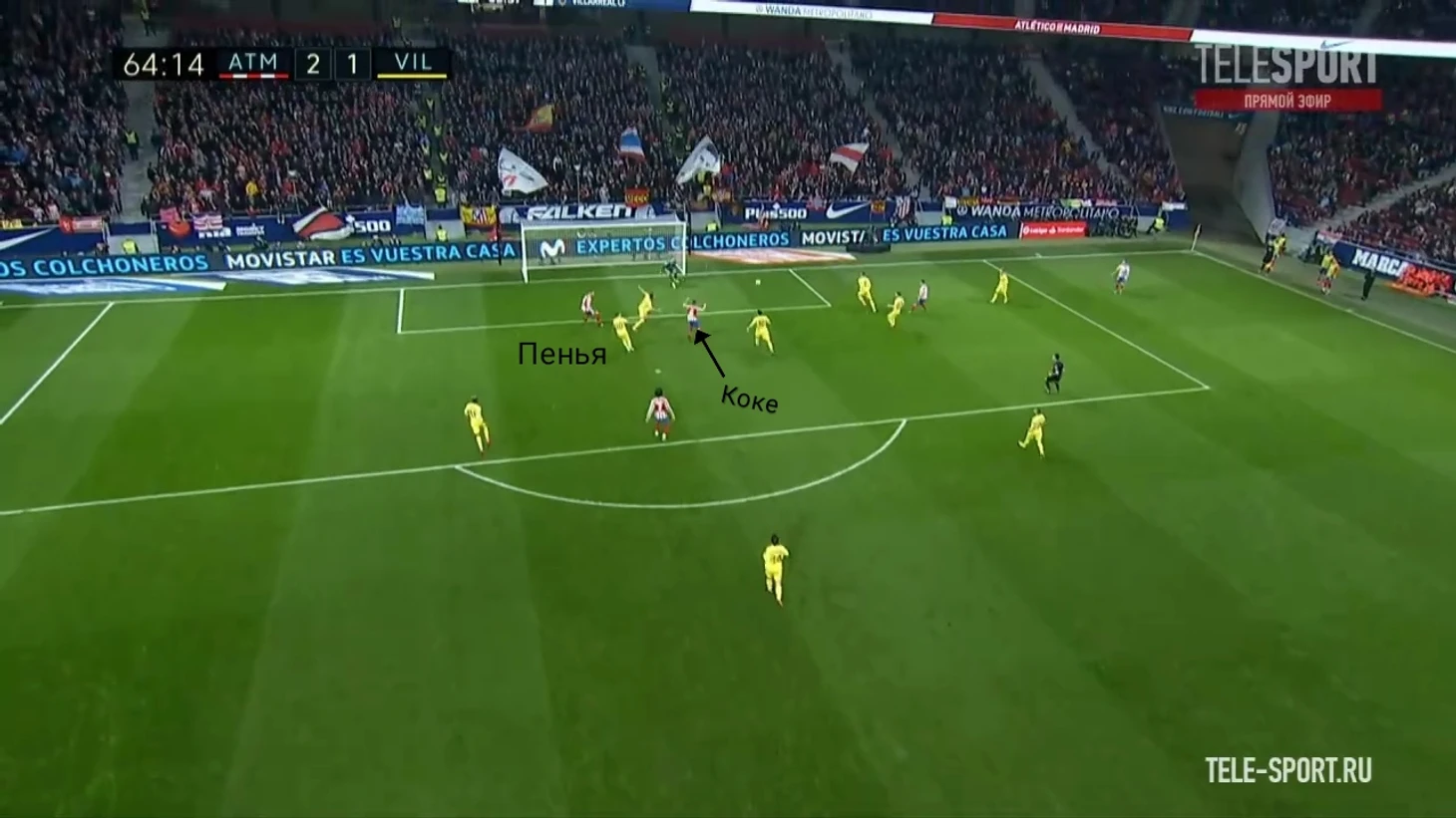 Второй тайм начался с давления «Атлетико», высоко встречали гостей при розыгрышах от ворот. В атаке также уповали на фланги, но остроту создавать не получалось. Двойная замена все изменила – победный гол пришел как по заказу при участии появившихся на поле. Феликс отличным переводом нашел на фланге Триппьера, тот отдал на свободного в чужой штрафной Корреа, навес аргентинца замкнул Коке. Он шел до конца, а отличие от Пеньи, который перед штрафной находился в лучшей позиции, но почему-то остановился в самый главный момент. Пау Торрес старался исправить ошибку партнёра, но мало что мог сделать.