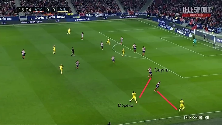 Гости же не проявили достаточную активность в атаке после забитого мяча, даже контратаки не всегда удавалось проводить. Но интересные особенности игры гостей при владении позволяли рассчитывать на большее. Иборра в большинстве случаев садился между центральными защитниками, над ними располагались Тригерос и Касорла, тем самым схема напоминала 3-4-2-1. Крайние нападающие в построении играли по разному – Мои Гомес открывался ближе к центру, чаще находясь в полуфланге, а справа Жерар Морено зачастую оказывался на фланге, предлагая вариант передачи с противоположного фланга. Когда открыли счёт ход сыграл, Морено принял мяч на фланге и сместился в центр, а Сауль и Лоди не разобрались что с этим делать. Бразилец в итоге играл по забеганию Пеньи, Сауль же поздно начал выдвигаться на Жерара. Именно последующий навес привел к голу, после отскока на линии штрафной первым на мяче оказался Алькасер. Через несколько минут Сауль уже вовремя встретил испанца, но взаимодействие на левом фланге с Пеньей все равно таило основную опасность в атаке гостей. В основном все сводилось к перекату мяча с одного фланга на другой.