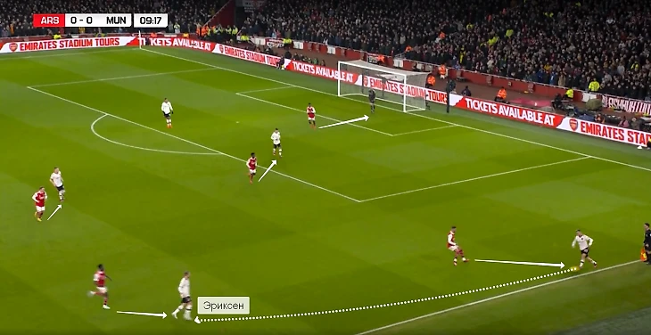 Эриксен ушел на фланг и пытался помочь левому защитнику. Но Парти временно покинул опорную зону и не дал датчанину развернуться с мячом.