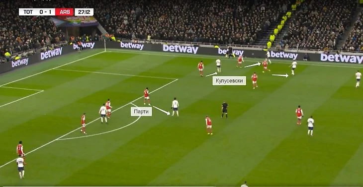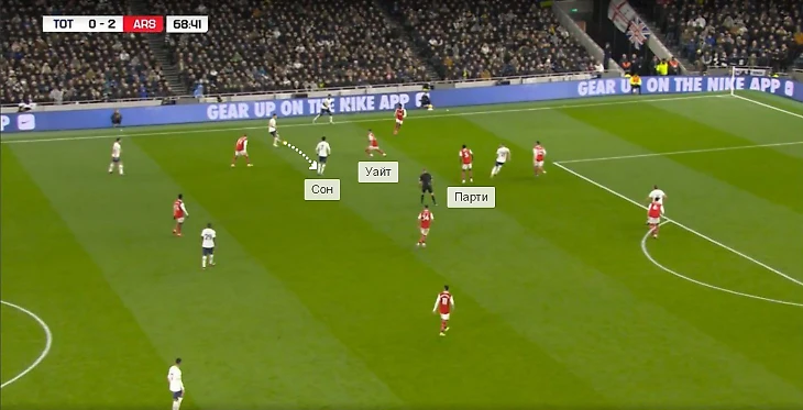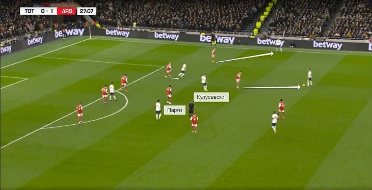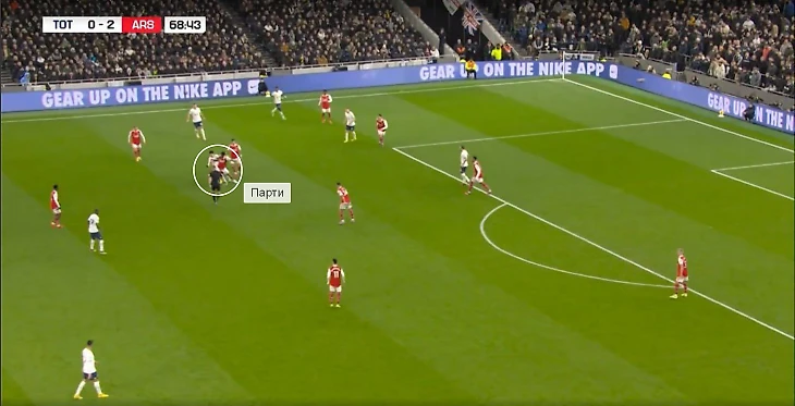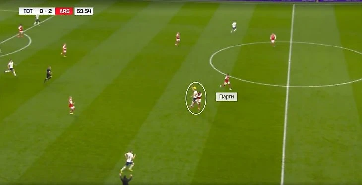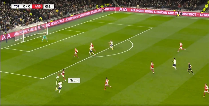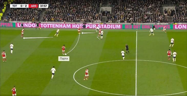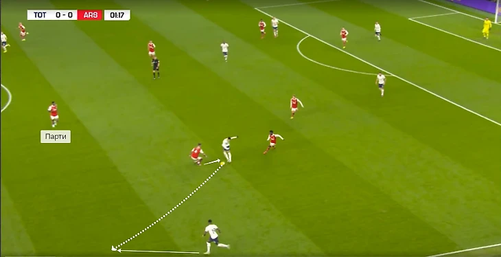 Яркий пример – «Тоттенхэм» накрывает 1-в-1 розыгрыш на фланге, Парти свободен и помогает выйти из-под давления. После приема он сразу развернул атаку направо.