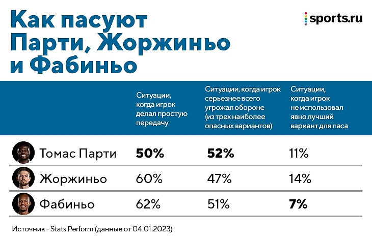 Томас блестяще справляется с ролью посредника между обороной и атакой. В сравнении с Жоржиньо и Фабиньо (схожее время на поле и число передач за игру в АПЛ) он чаще пасует между линиями, делает это точнее и быстрее (соперник чуть реже успевает накрыть прессингом).