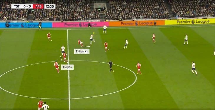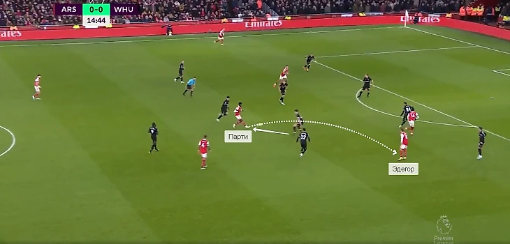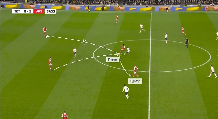 Показательный эпизод из игры с «Тоттенхэмом». Парти под давлением – наиболее безопасным вариантом будет пас на Габриэла, но Томас замечает открывание Эдегора ниже и делает передачу в касание.