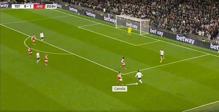 • Разрушение в опорной зоне (прямая работа). Во втором тайме справа Уайт оказался в полуфланге и выбросился на игрока с мячом. Рядом свободно открылся инсайд «Тоттенхэма».