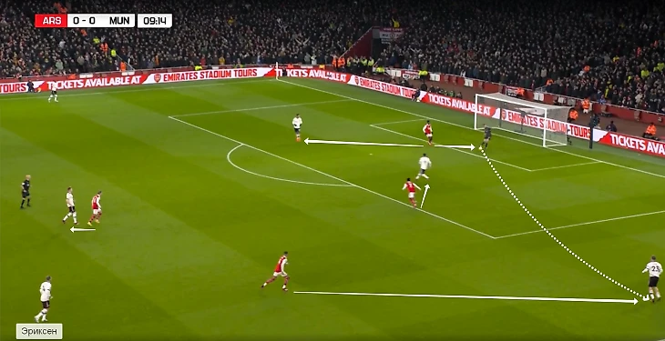 «Арсенал» использует гибкую схему при владении. В центре поля сформировалась устойчивое сочетание: Парти отвечает за сохранение мяча в начале атаки и доставку его выше через пас, Джака насыщает левый полуфланг и делает рывки в штрафную вторым темпом, а Эдегор ищет пространство по всей ширине поля.