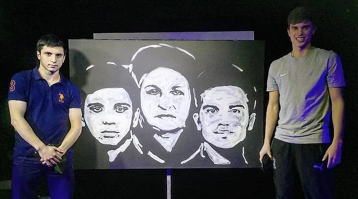 Играла музыка и тут резко она обрывается, выходит художница, начинает на холсте рисовать картину, перевернутую вверх ногами. Мы не понимаем, что она рисует. И только, когда она почти дорисовала, мы поняли, что посередине изображена директриса Ольга Владимировна Андреева, слева Шапи, а справа я. Это было неожиданно и приятно, что мы попали на холст со школьным директором.