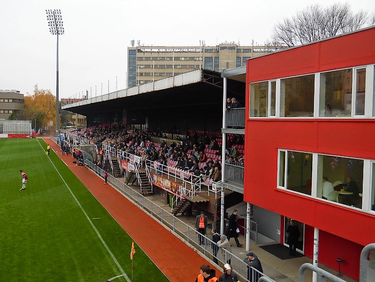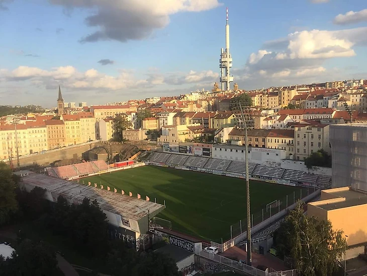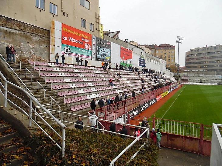 Есть тут и местный средний класс, и семьи, и хипстеры – район в Праге относительно дорогой. В общем аутентичный городской стадион, очень хорошо показывающий этот район и город изнутри. Вмещает 5 тысяч зрителей, заполняемость сейчас около 1000.