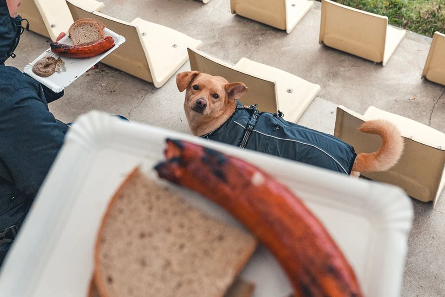 Многие болельщики берут на матчи своих четвероногих друзей, которые всегда не прочь перекусить. Особенно чем-то вкусным! Собаки не стесняются проявлять свою любовь к еде. Каждый владелец собаки прекрасно знает: если у тебя в руках еда, можно гарантировать, что твой питомец уже бегает где-то поблизости, вынюхивает, пускает слюни и готовится сверлить тебя своим жалостливым и просящим взглядом. И нужно иметь по-настоящему стальное сердце, чтобы суметь противостоять этим мастерам попрошайничества, которые точно знают, как получить то, что они хотят, используя все имеющиеся в арсенале методы!