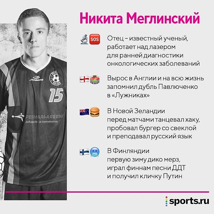 Никита Меглинский – парень с искренней тягой к футболу и путешествиям по миру: к 26 годам успел стать первым российским футболистом в Новой Зеландии, поиграть в заснеженной Финляндии и на олдскульных стадионах в Англии. Если вы немного увлекаетесь физикой, то фамилия игрока покажется вам знакомой: отец футболиста – знаменитый физик Игорь Владиславович Меглинский, профессор Астонского университета (Великобритания).