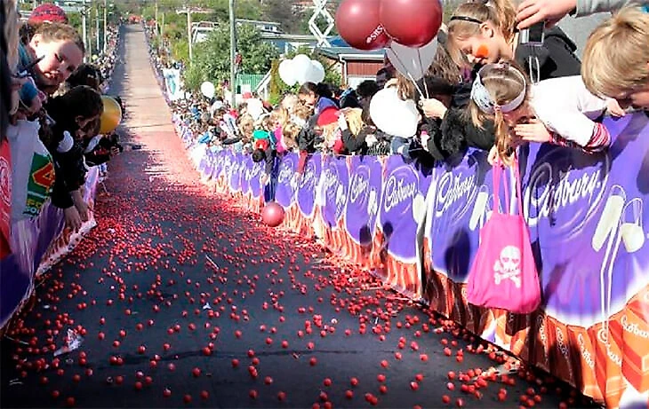 – В Данидине находится Болдуин-стрит – самая крутая улица в мире (в резких участках угол подъема составляет 13 градусов – Sports.ru). Каждый год там запускают шоколадную гонку. На самый верх улицы выносят много маленьких круглых конфет в глазури. Все они одного цвета и к каждой приклеен номер. По команде их запускают. На преодоление спуска нужно 15-25 секунд, при этом скорость развивается в районе 100 километров в час. Первые пять пришедших шаров объявляются победителями.
