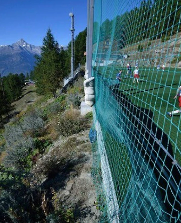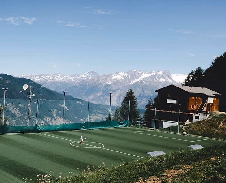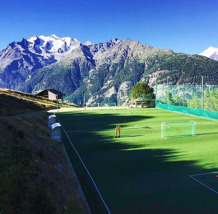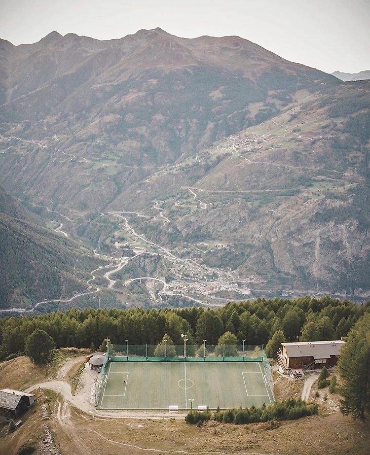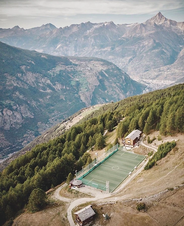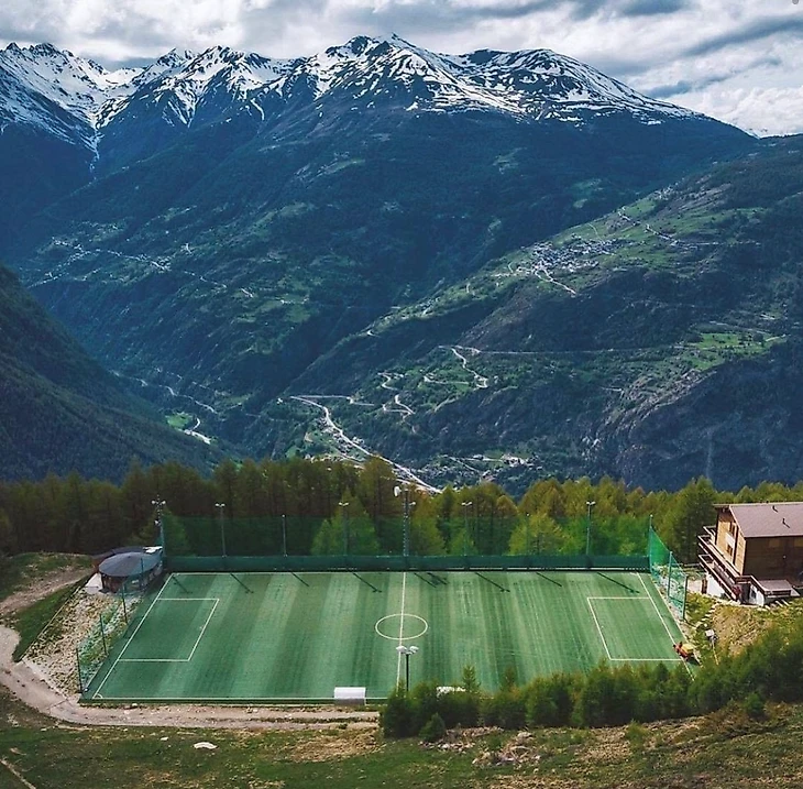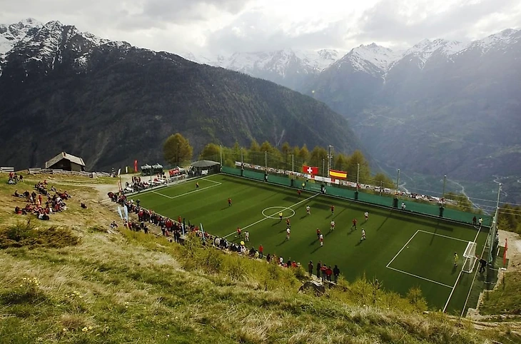 В швейцарском муниципалитете Вале, на юге Швейцарии, есть небольшая альпийская деревушка, состоящая всего из 70 деревянных домиков. Это известный в районе горнолыжный курорт Гшпон, который в последние время прославился не сумасшедшими трассами, а самым высоким футбольным полем Европы.