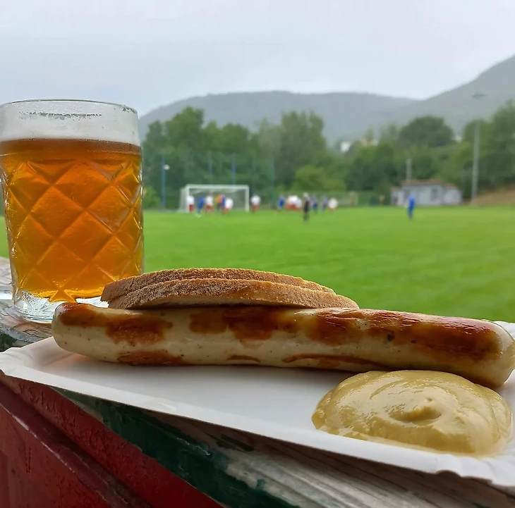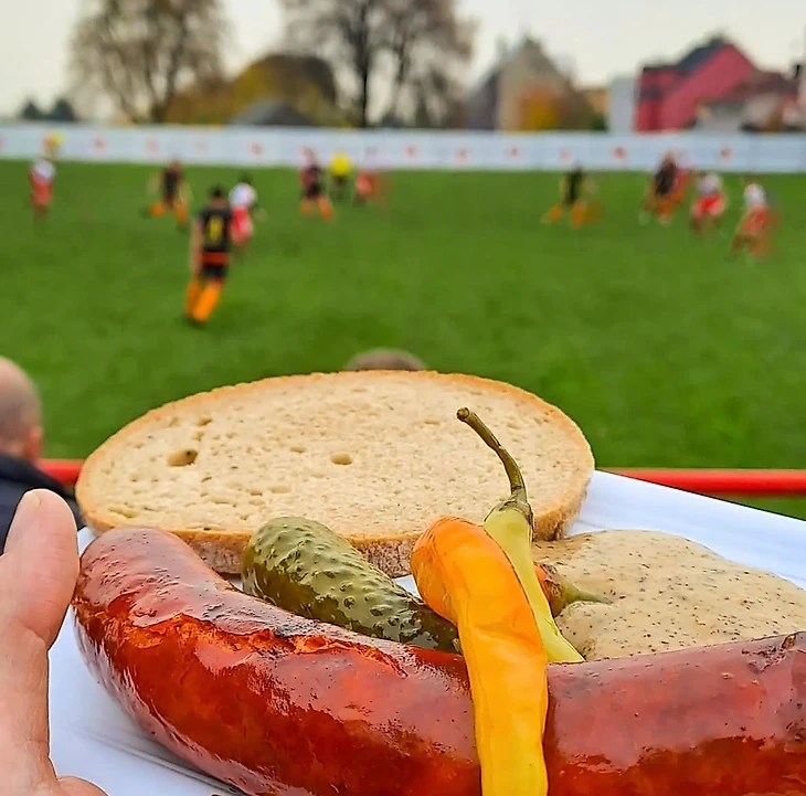 На матчах все по красоте: верная сотка местных жителей весь матч топит за ребят, бокалы пенного наполняются с не меньшей периодичностью, чем Холанд кладет голешники в АПЛ (даже песик загрустил), а аромат сочной колбасы сводит с ума окружающих.