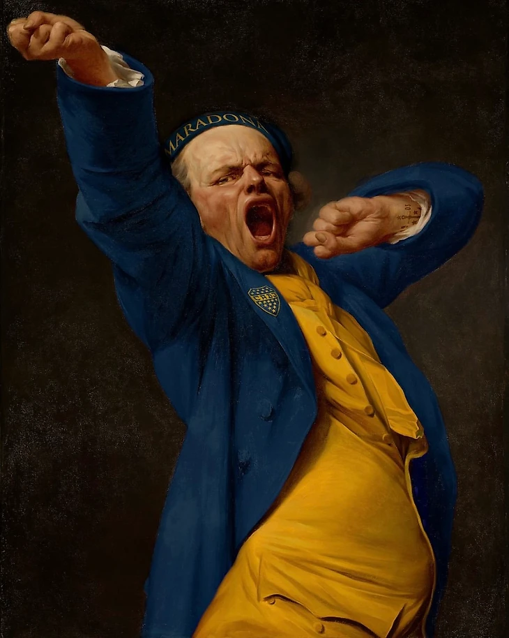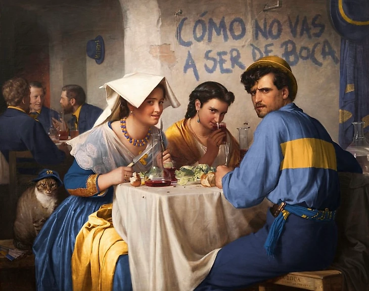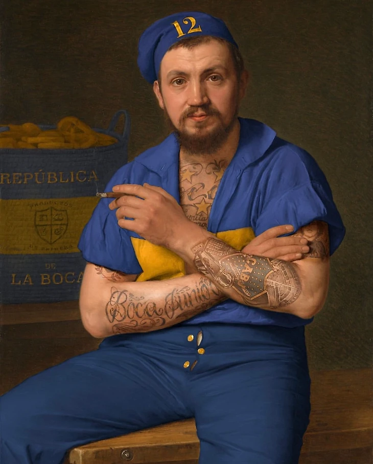 Знакомьтесь: аргентинский публицист Бруно Аканфора, который зажигает в соцсетях, где делится созданием «бокарта». Это слово было придумано им для обозначения интервенций всемирно известных произведений искусства с цветами и символами «Бока Хуниорс».