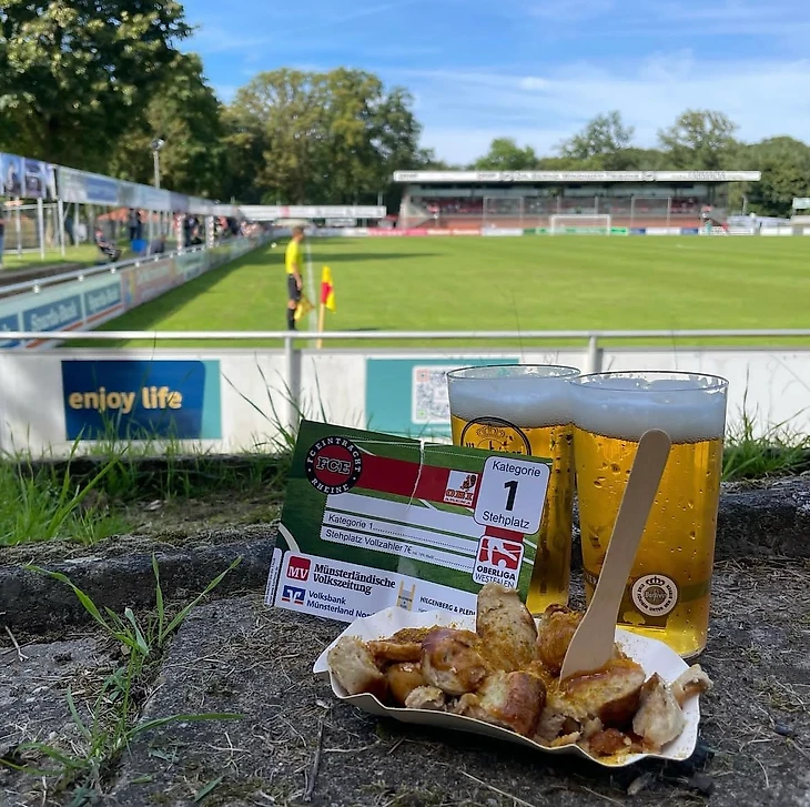 Билет на матчи стоит 7 евро, в придачу берем два бокальчика пенного по 2 евро, а вприкуску карривурст за 3,5 евро.
