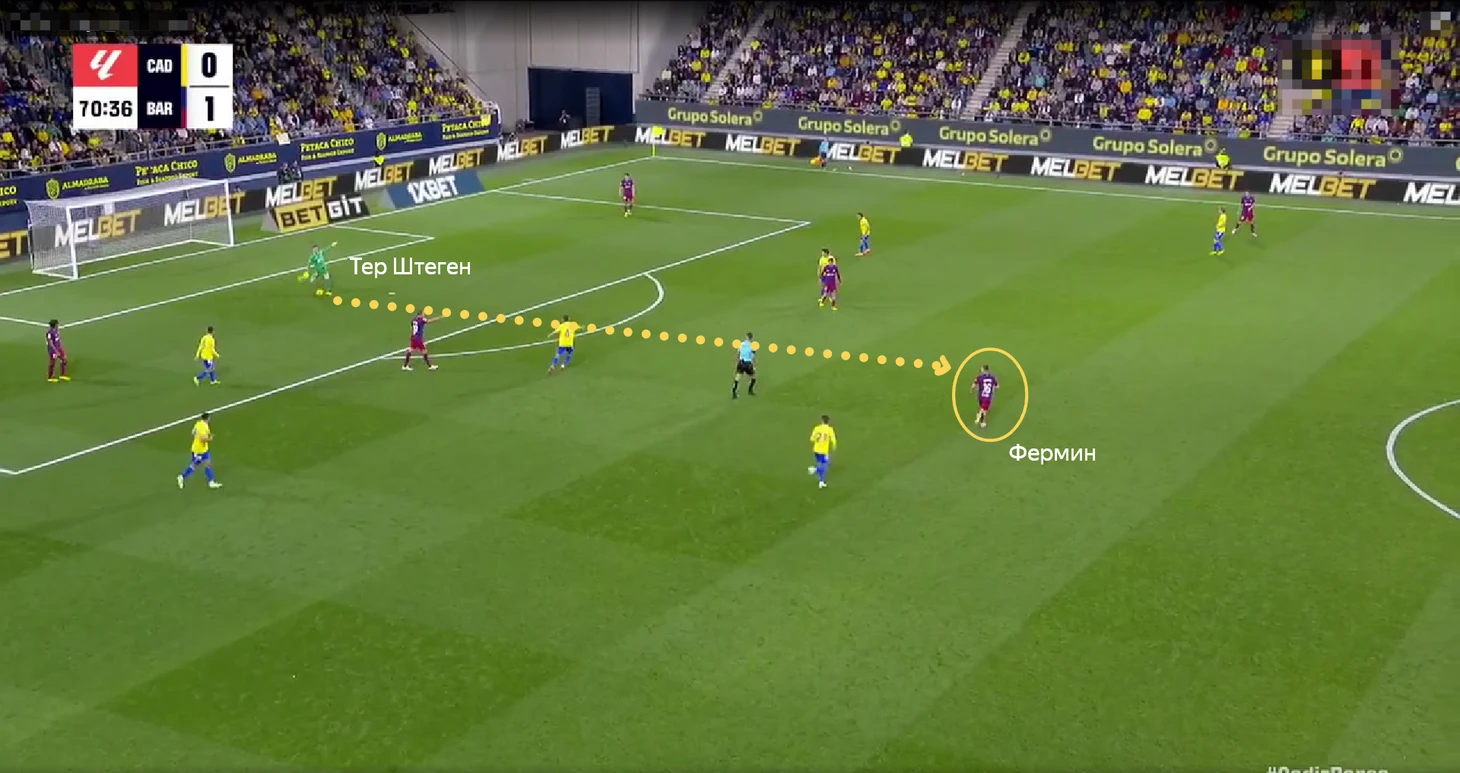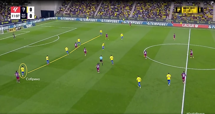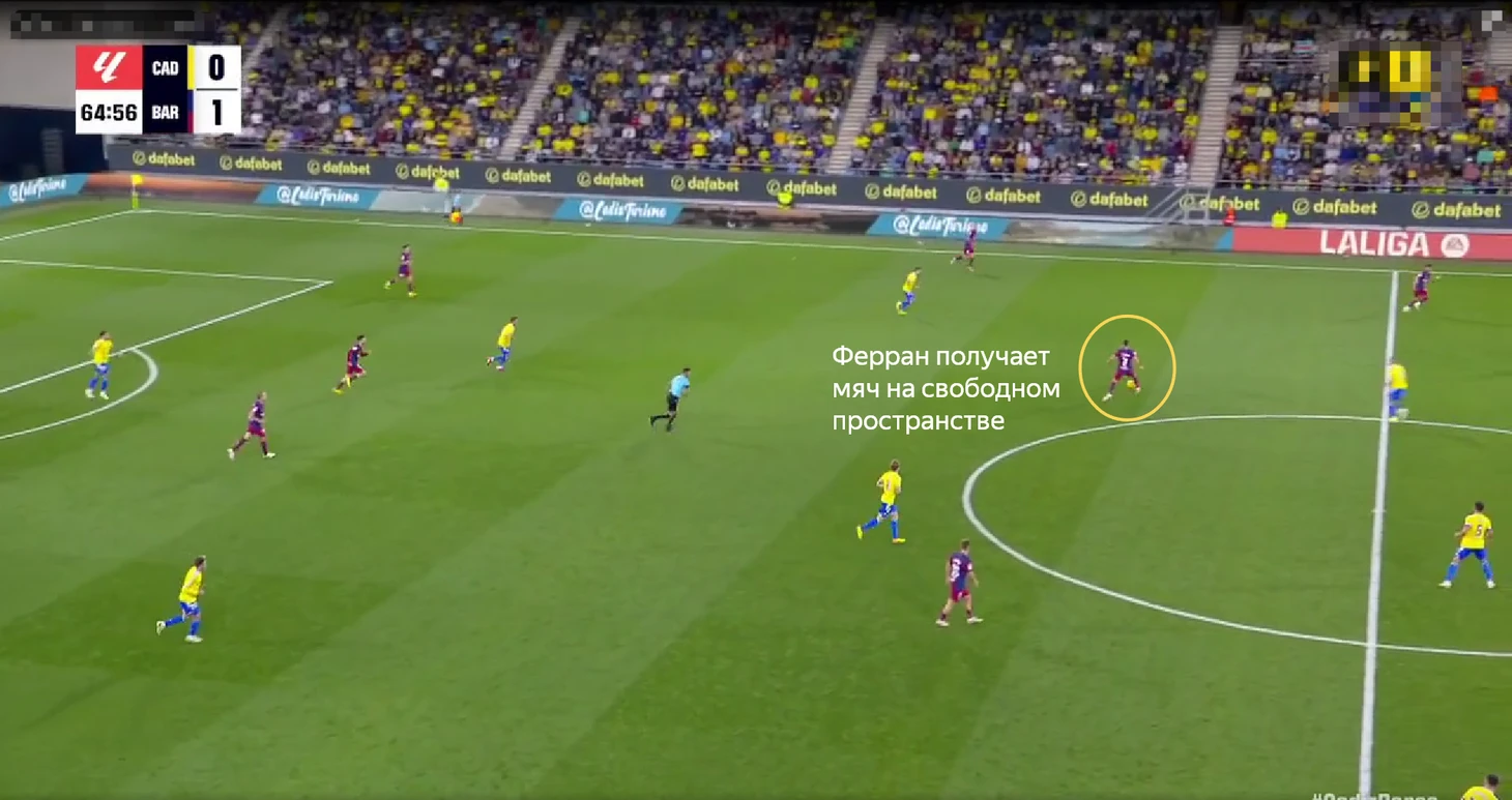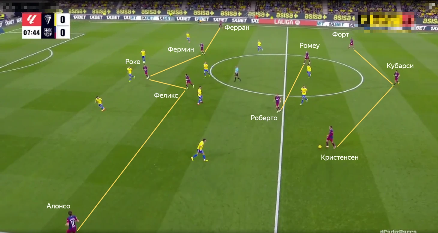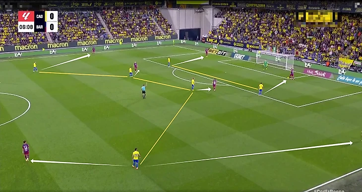На более поздних стадиях, когда у команды Хави образовывалась пятёрка в последней линии оборона «Кадиса» переходила на пятёрку за счёт опускания одного из вингеров – стандартный ход в матчах против «Барселоны» и многих других команд, использующих пятерых футболистов в атакующей линии.
