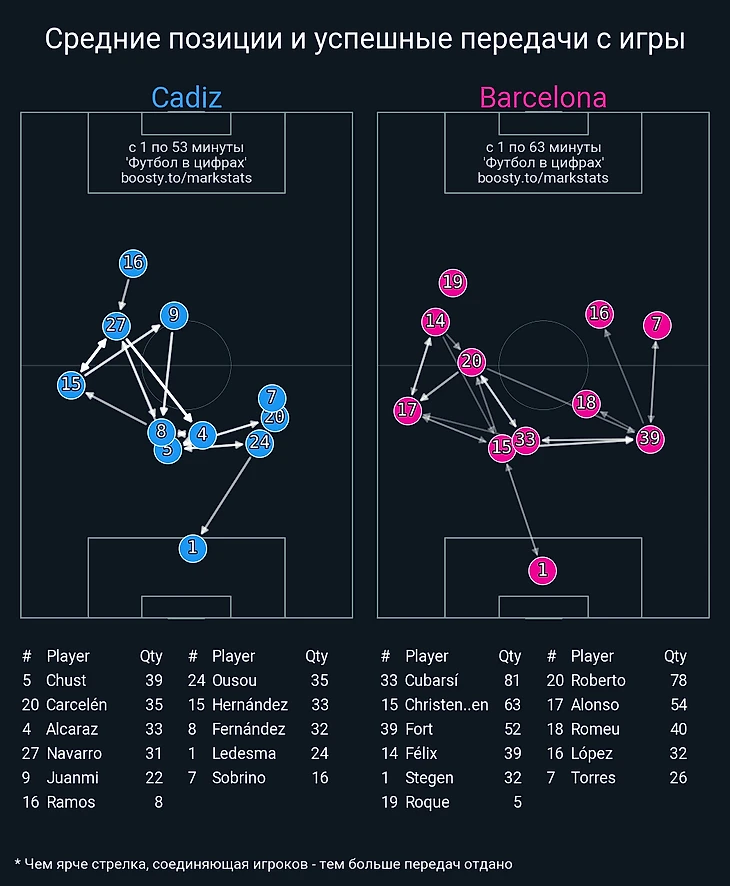 Против «Кадиса» обращал внимание на передачи другого типа – пасы низом, которые доставляли мяч игрокам между линиями и отрезали сразу группу футболистов противоположной команды. Вот несколько примеров.