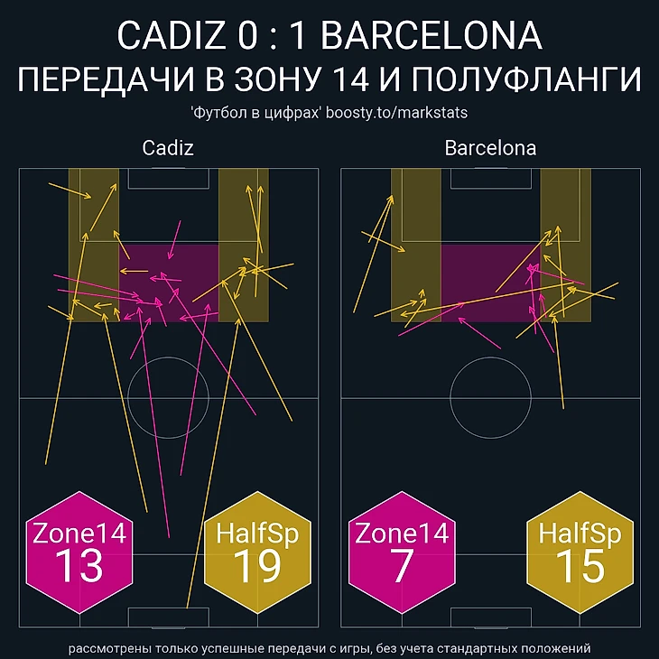 Или вот иллюстрация с передачами в зону 14 (перед штрафной) и полуфланги – тоже низкие показатели и отставание команды Хави.