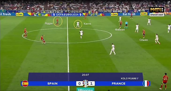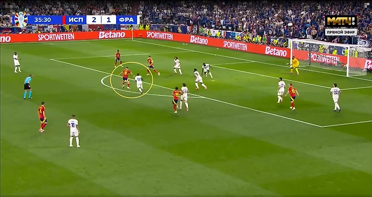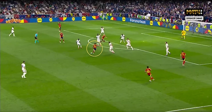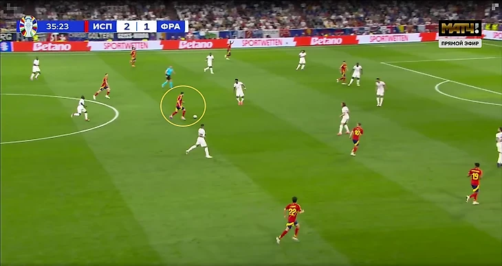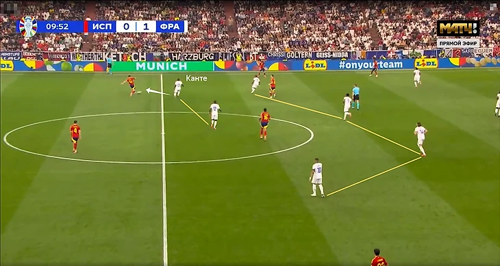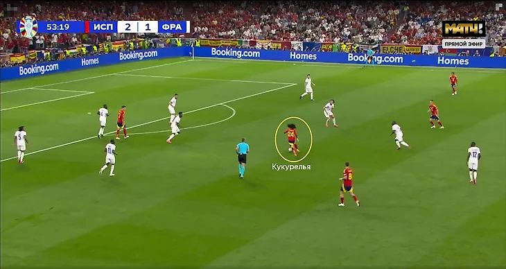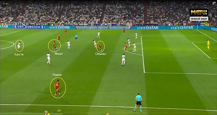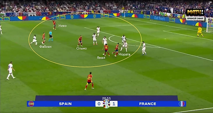 Подобная структура игры без мяча приводила к ряду проблем – из-за высокой позиции Канте регулярно больше свободы образовывалось в опорной зоне французов. Это усугублялось действиями испанцев – в центр смещались Нико и Ямал, также там располагались Фабиан Руис и Ольмо, а с позиции центрального нападающего опускался Мората.