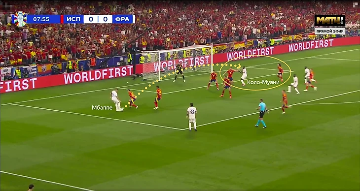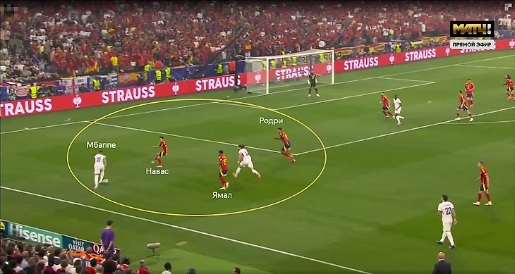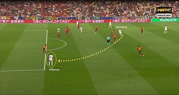 Футбол французов строился вокруг действий без мяча и в атаке многое строилось на действиях в контратаках на свободном пространстве. Очевидно, что большой упор делался на зону Мбаппе. В начале матче испанцы могли втроём встречать Килиана (Навас, Родри, Ямал).