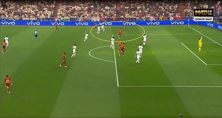 Здесь Канте находился в более высокой позиции, ориентируясь на Родри. Больше свободы между линиями получили Фабиан Руис и Дани Ольмо. Затем испанцы нагрузили центральную зону – эпизод закончился голом Ямала.
