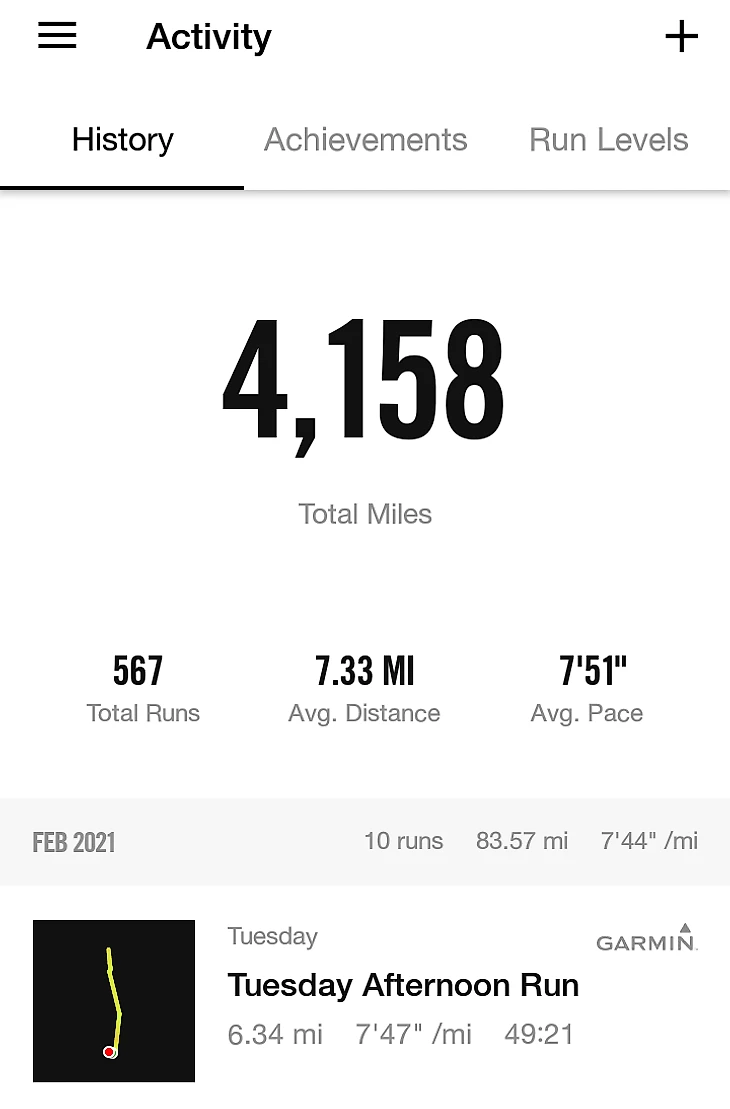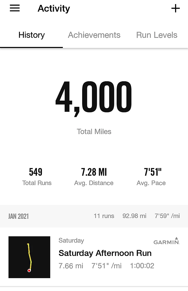 Мой нынешний беговой объем в NIKE RUNNING CLUB составляет 4 000 > миль - по состоянию на 17 января 2021 года.