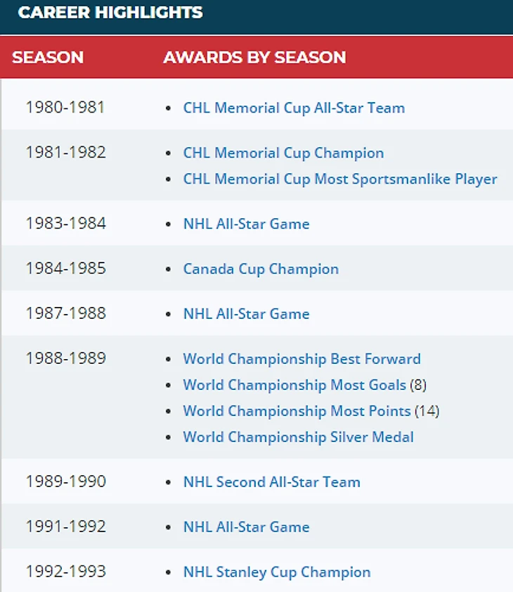 19 сезонов в НХЛ за Баффало, Айлендерс, Монреаль, Сент-Луис, Даллас и Колорадо.