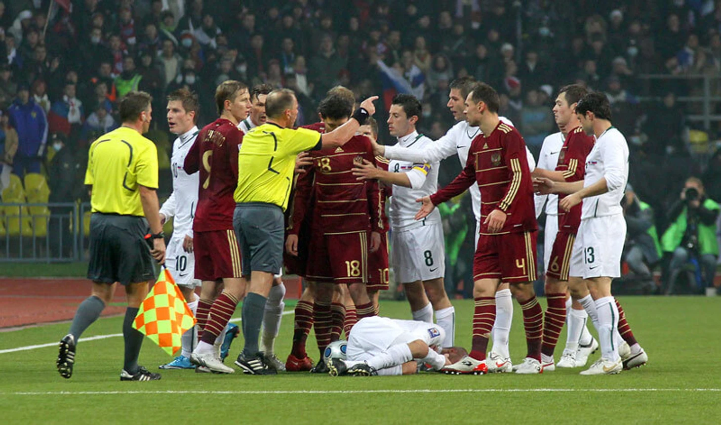 Отборочную группу Россия прошла довольно неплохо: 7 побед, 2 поражения от лидера группы Германии и ничья в ничего не решавшем матче в Баку. Национальная команда заняла 2-е место после Германии и должна была играть в стыковых матчах. Игры со Словенией получились крайне драматичными. Хорошее начало в домашнем матче и проваленная концовка, итоговый счёт - 2:1; в Мариборе произошла катастрофа: при абсолютно безвольной игре наша команда проиграла 0:1 и пропустила второй чемпионат мира подряд. По итогам провала произошли перестановки в РФС: президент Мутко ушёл его сменил Сергей Фурсенко. Было решено не продлевать контракт с Гусом Хиддинком и искать нового специалиста на его место.