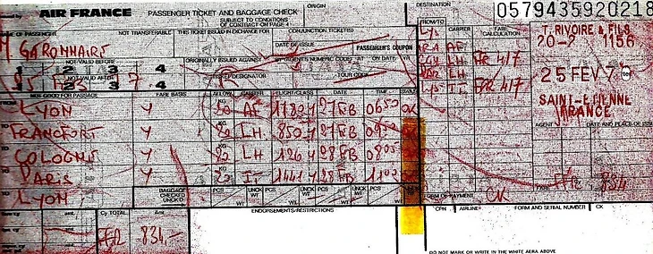 Авиабилет кинооператора Сент-Этьенна Шамбергера на матч Кёльн-Динамо, с четырьмя пересадками (Лион-Франкфурт-Кельн-Париж-Лион).
