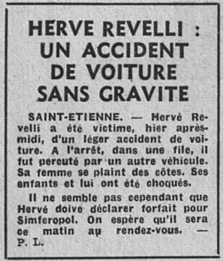 Довершая блок новостей, Эрве Ревелли, центрофорвард Зелёных, попадает в небольшую дорожную аварию. Между прочим, вторую для Зелёных за последние два месяца. Когда машина Эрве остановилась в линии, она получила удар от другого автомобиля. Его жена жалуется на боли в ребрах. Он и его дети-шокированы. К счастью, по мнению газеты, это скорее всего не лишит его поездки в Симферополь.