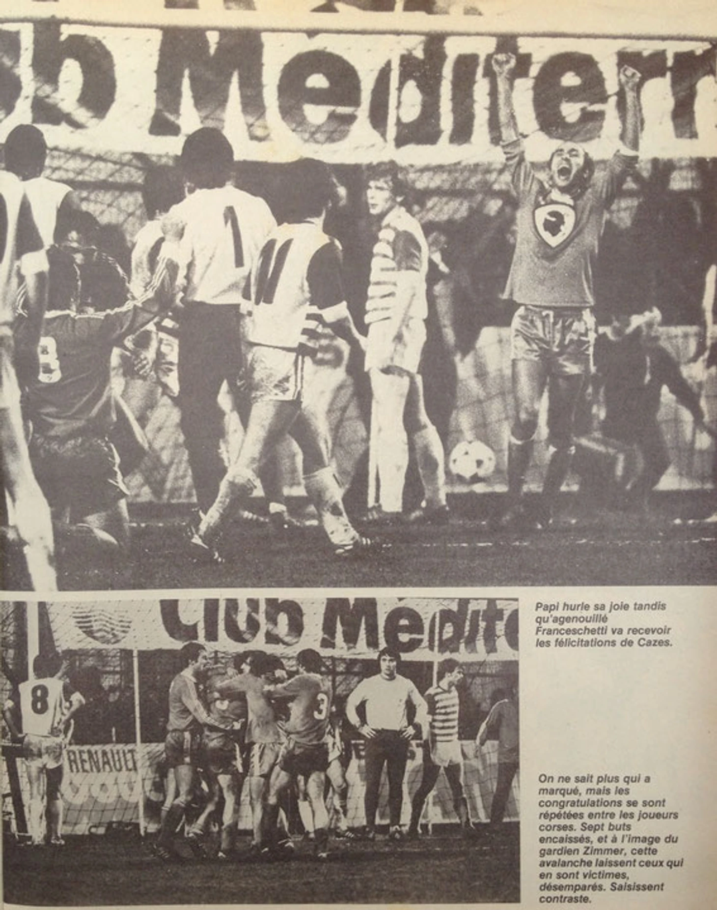 Лакюеста дважды, Ларио и Жан-Луи Каз, все они были близки к тому, чтобы открыть счет, пока Папи не удался этот божественный удар слёта по отскочившему от газона мячу, влетевшему по дуге в правый дальний угол ворот, вне досягаемости для отчаянного броска Бербига. Последовавшее вторжение на поле торжествующих поклонников Бастии было незабываемым как в их попытках устоять на ногах посреди этого мессива из воды и грязи, так и в их безудержной радости. С финальным свистком и так с трудом сдерживаемые волны эйфории поглотили стадион.