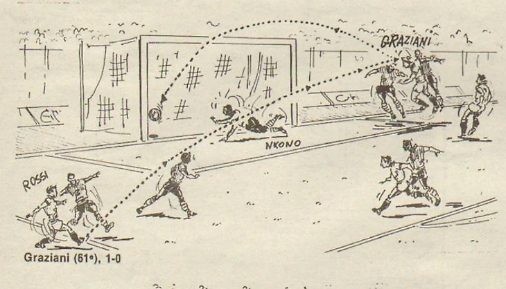 23-е июня 1982, Виго, стадион Балаидос, последний матч группового турнира первого раунда на Мундиале-82, в первой группе.... Истекала предпоследняя минута перед тем, как часы пробьют 7 вечера. И в эту минуту вся Италия едва не погрузилась в преисподнюю....В последнем матче группового турнира Скуадра адзурра , даже имея лишь ничью 1-1, уже с наслаждением предвкушала финальный свисток и проход в следующий раунд, поскольку при равенстве очков с Камеруном, опережала его по разнице мячей. И матч действительно уверенно катился к ничьей, которая, казалось, устраивала и камерунцев. И вдруг на предпоследней минуте матча случился момент, который мог иметь эффект разорвавшейся бомбы. Вошедший в итальянскую штрафную камерунец сумел остановить направленный верхом мяч и буквально на какие то доли секунды оказался в ударной позиции перед воротами Дино Дзоффа…..Какой сумасшедший поворот мог произойти как в матче, так и во всем турнире вообще! Точный удар наверняка бы похоронил Италию, будущего чемпиона мира, между прочим. И чемпионом мира тогда скорее всего стала бы Бразилия, которую кроме Италии тогда некому было остановить....