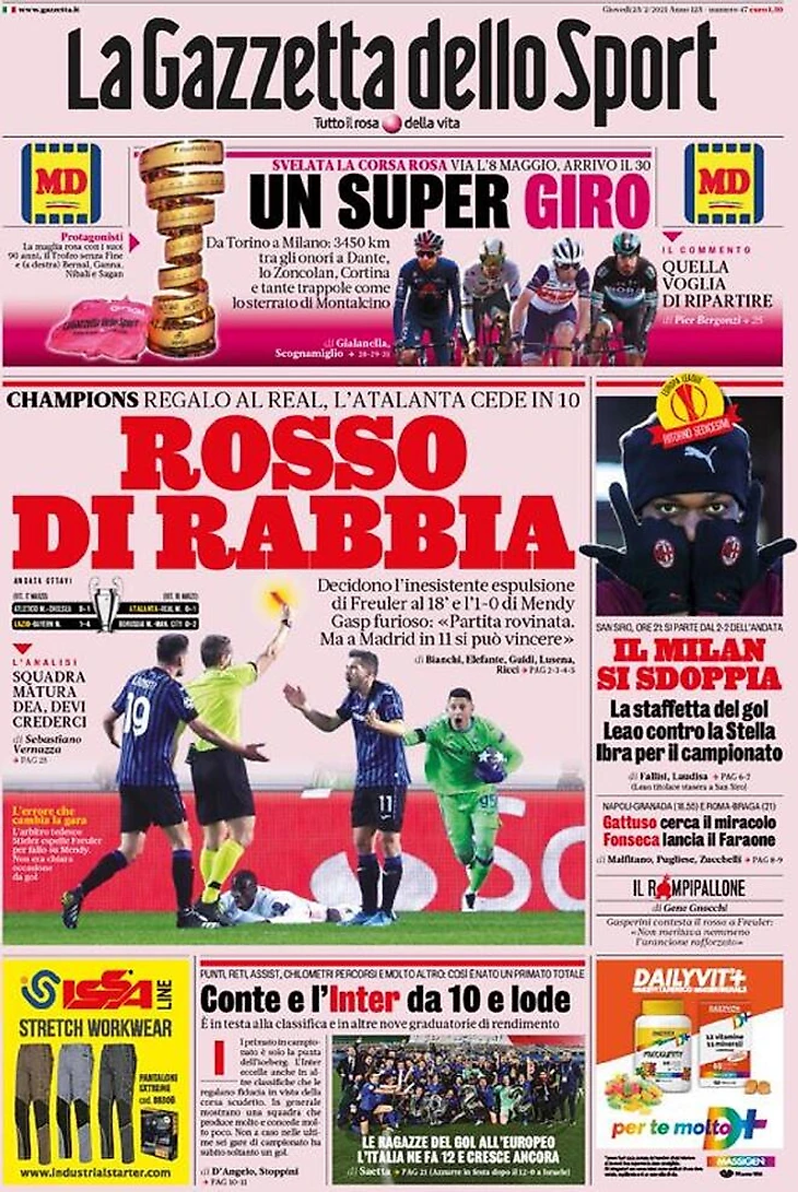 «Богиня» - одно из прозвищ команды из Бергамо. Итальянские журналисты негодуют от решения Тобиаса Штилера, впрочем, как и вся Италия, а в месте с ней и большая часть футбольного мира. Немец принял крайне странное решение, трактовав столкновение Фройлера и Менди, произошедшее на 17 минуте матча, как фол последней надежды и удалил с поля швейцарца. Далее «Аталанте» ничего не оставалось, кроме как обороняться и пытаться сохранить ничейный результат. Учитывая что в атаке, после травмы Сапаты, ничего толкового команда создать не смогла. И под занавес матча Менди дальним ударом застал врасплох кипера «Аталанты». «Tuttosport» приводит слова негодования тренера «Аталанты»: