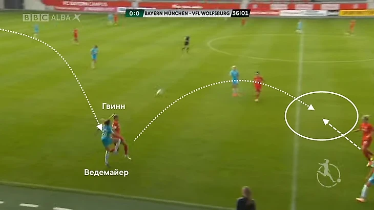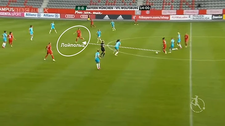 Лина двигается с мячом на чужую половину и замечает открывание Лойпольц между линиями. В итоге «Вольфсбург» и не накрыл вовремя соперника, и оставил достаточно свободного пространства для игроков «Баварии»: