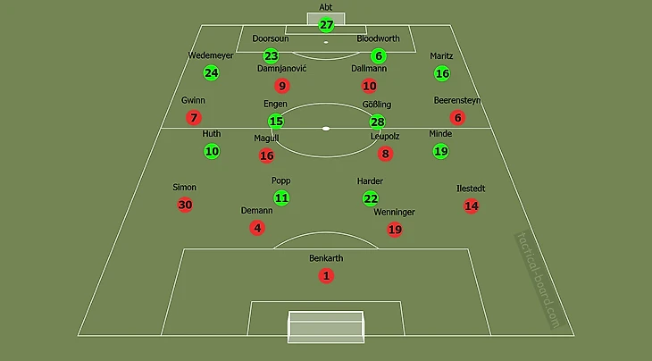 Линда Далльманн провела очередной великолепный матч. Стартовав на позиции нападающего, она опускалась ниже для розыгрыша мяча, смещалась на фланги для создания численного преимущества, отрабатывала в игре без мяча, в общем, проделала огромный объём работы. Вот эпизод, где она собрала на себе несколько соперников и отдала передачу под удар партнёру:
