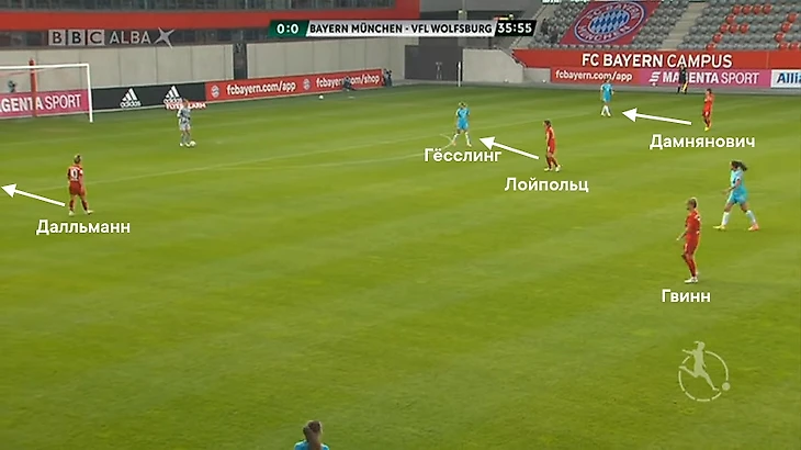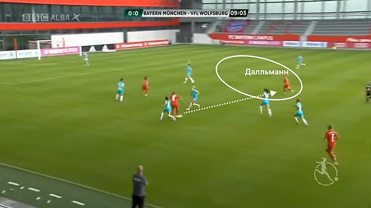 Здесь Далльманн открывается на линии офсайда, но её накрывают большим числом. Сразу после этого «Бавария» начинает активное давление: